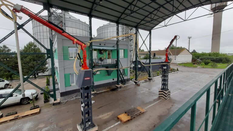 - Телескопическая стрела 4.42 м + угол поворота 350° покрывает зоны разгрузки двух потоков автотранспорта .